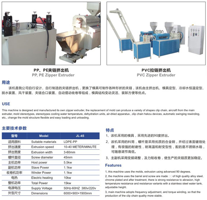 RC zipper extruder Usage of zipper extruder: the machine is a chain clamping extruder designed and manufactured by our company. It can make all kinds of chain clamping by changing the mold. The machine is composed of main extruder, mold setting, constant temperature setting of cooling water, dehydration device, air drying device, chain clamping device, automatic swing winding, etc. the mold structure is flexible and easy to load and unload.